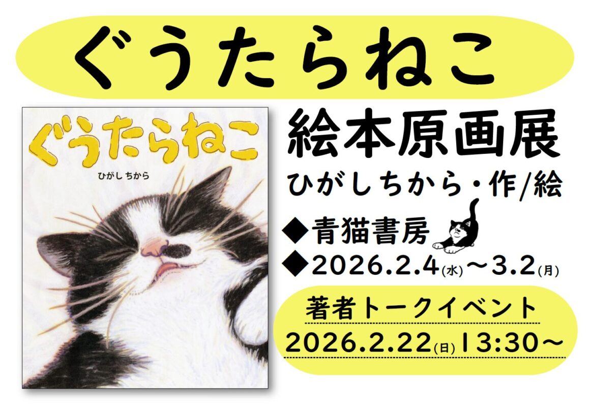 猫の本もたくさん扱う書店、子どもの本 青猫書房さんで、絵本『ぐうたらねこ』の原画展を開催します。