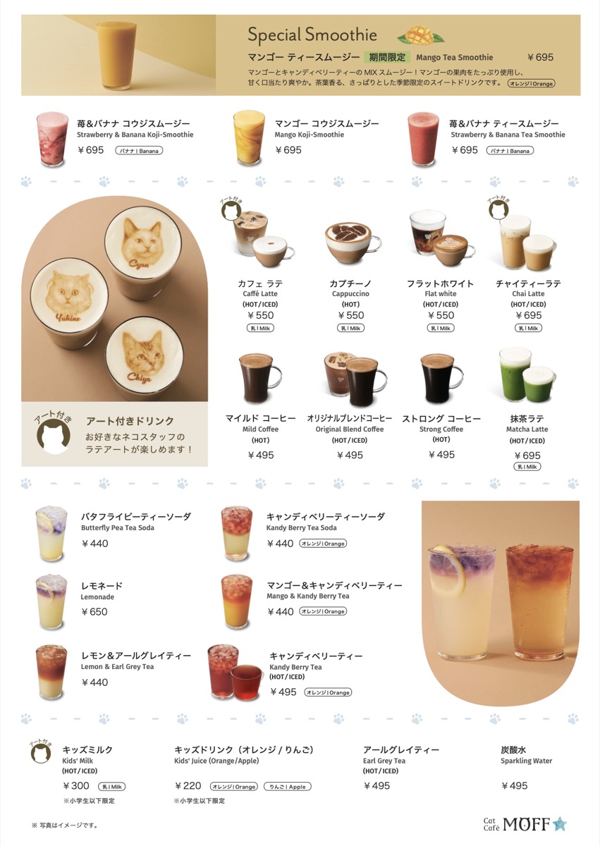 人気の猫モチーフのラテアートをはじめ、抹茶ラテや香り豊かなティー、スムージー、季節限定ドリンクなどを用意。
