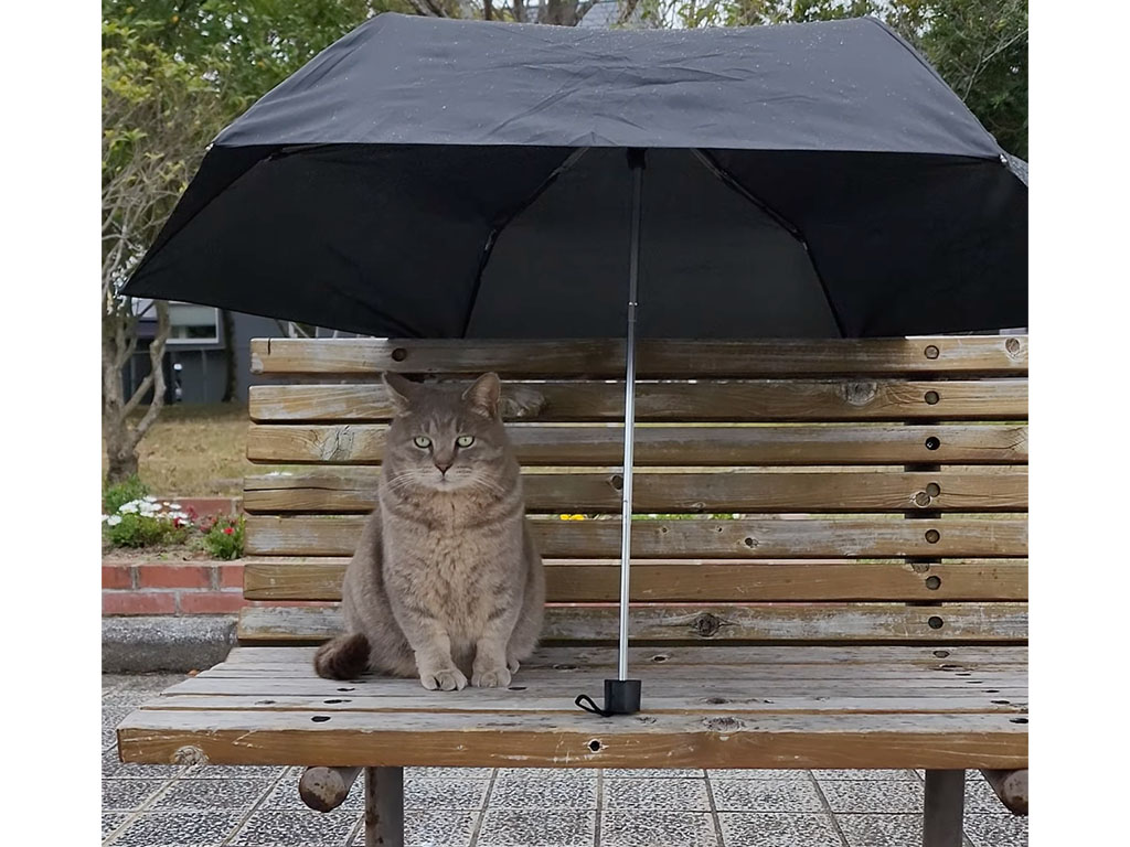 雨の日のベンチで待つ猫さんに傘を貸してあげたら、まるで映画のような光景に