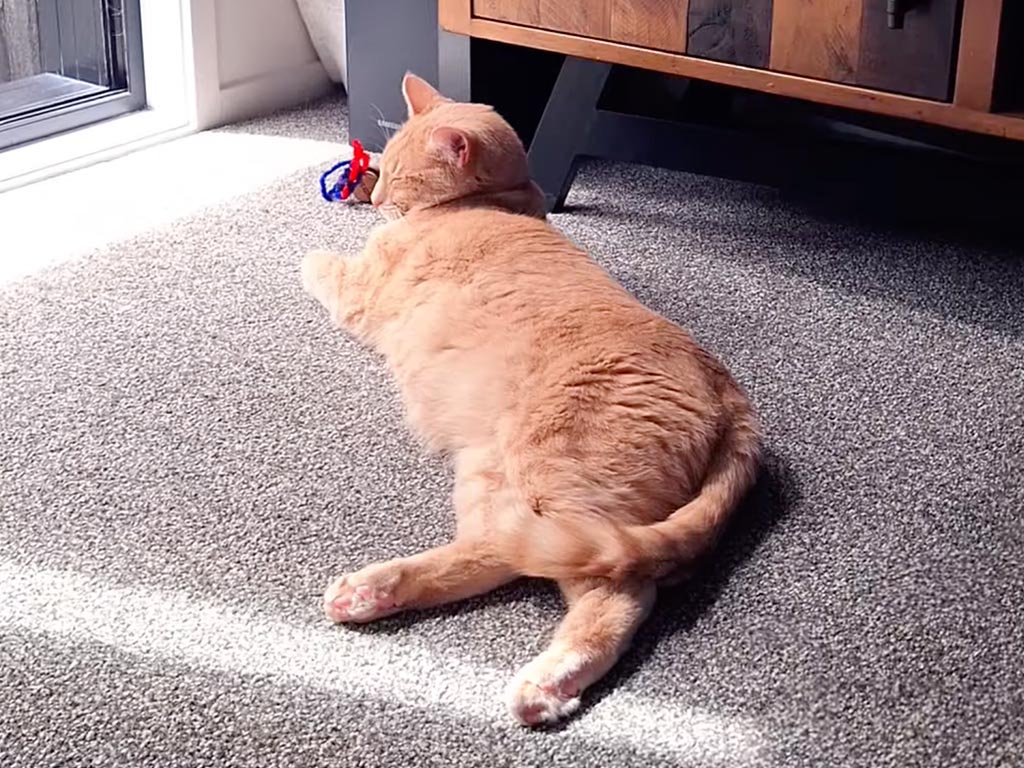 おやつが取れない…でも楽しい! 飼い主さんの手作りおもちゃに夢中な猫さん