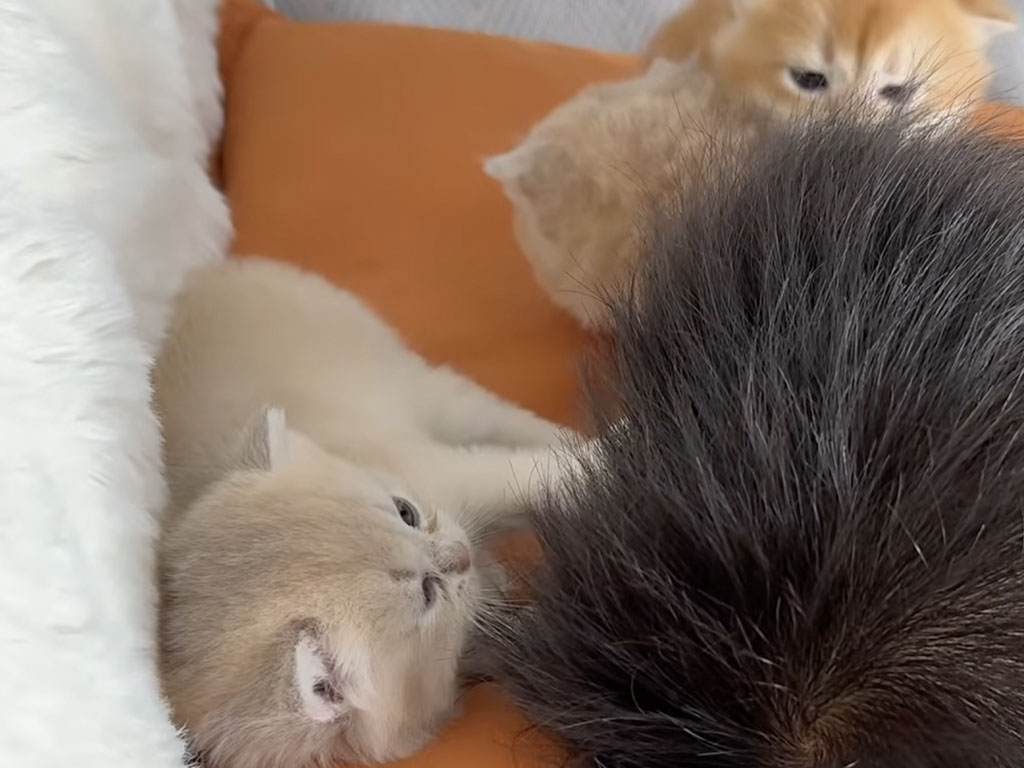 眠る少年を囲んで頭をもみもみ、ほっぺをぺろり! 子猫たちの愛情全開タイム